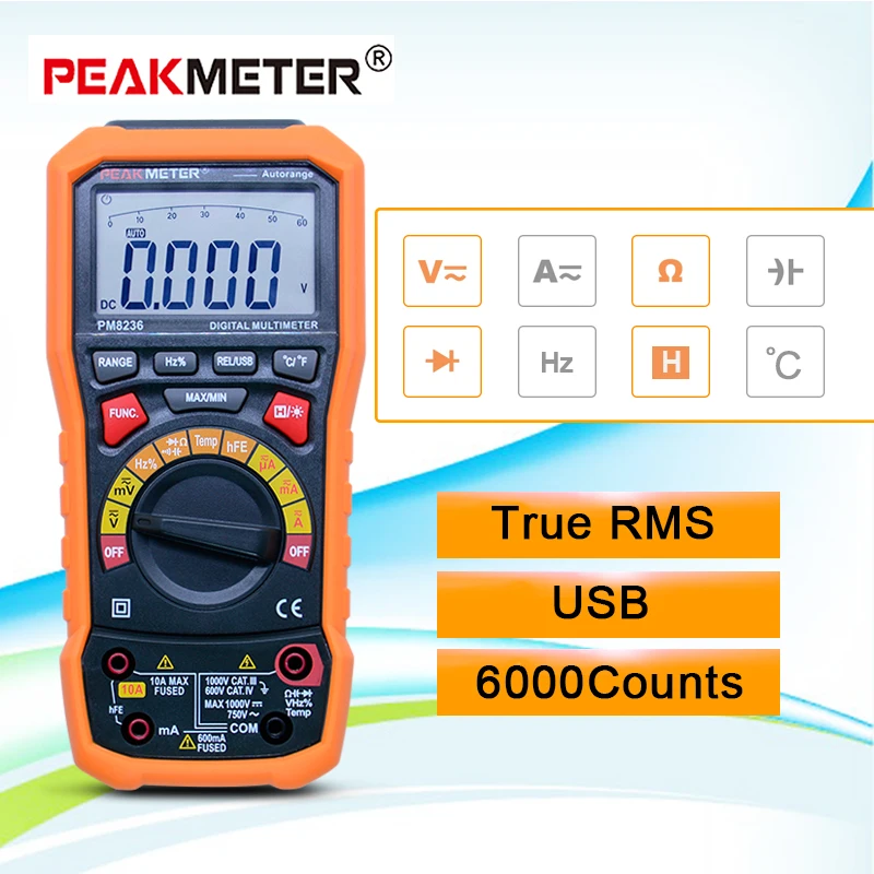 .image of PEAKMETER MS8236 6000 Counts Digital Multimeter with T-RMS / USB 1000V 10A 60M Ohm 100mF 10MHz Duty